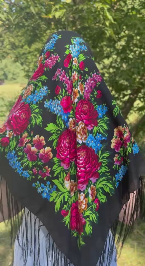 Black Ukrainian Shawl 120x120 cm Wool Scarf with Floral Design